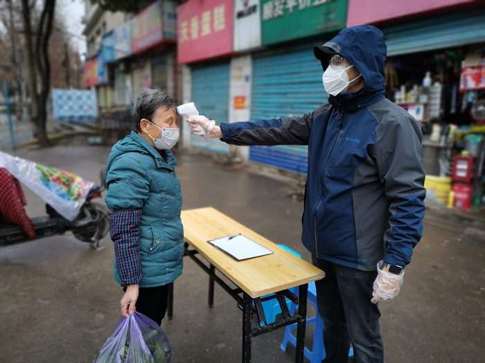 2月14日,青山區(qū)廠前街道鐵鋪嶺社區(qū)。武漢交投集團黨員突擊隊員余皓、李慶濤早早地來到社區(qū)防控值勤卡點。這里是鐵鋪嶺社區(qū)平日最為繁華的菜市場,一天忙碌的防控工作由此開始。這一天兩名隊員身兼“數(shù)職”,既要當好疫情防控的精準摸排者和科學宣教者,還要當好措施落實過程中的耐心勸導者。