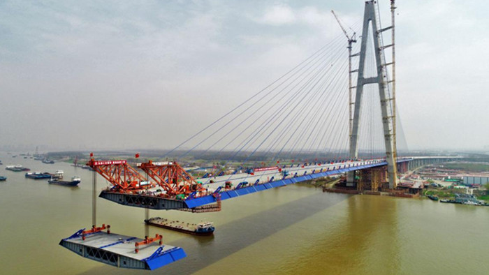 青山長(zhǎng)江公路大橋鋼箱梁吊裝施工現(xiàn)場(chǎng)