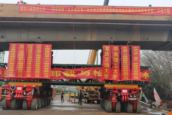 此次南四環(huán)線跨高速公路天橋拆除工程經(jīng)歷了裝備場外拼裝、臨時封閉半幅交通、模塊車定位、橋梁預(yù)頂、切割、頂升、下放馱運(yùn)、落架等環(huán)節(jié),全面實現(xiàn)安全、低交通影響、快速、節(jié)能環(huán)保等任務(wù)目標(biāo)。這也是該項技術(shù)首次在湖北地區(qū)實現(xiàn)應(yīng)用,為湖北省技術(shù)創(chuàng)新重大項目——千噸級梁橋快速更換技術(shù)及智能裝備提供了工程科技示范。