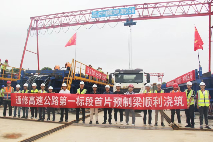 9月13目上午10點18時,通修高速公路首片預(yù)制箱梁在通修高速公路第一標(biāo)段項目部梁場順利澆筑。