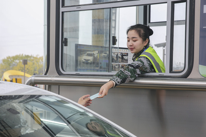 12月26日12點(diǎn),收費(fèi)員為駛?cè)胛渖罡咚俸倍谓鸶凼召M(fèi)站的第一臺(tái)車輛發(fā)放通行卡