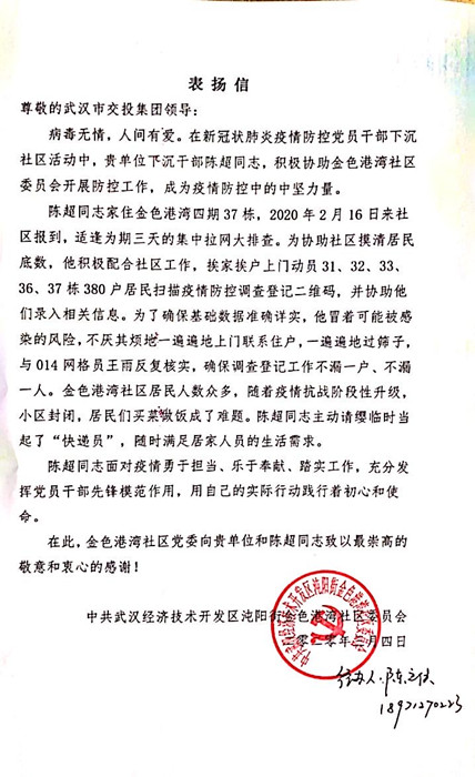 3月4日,全國(guó)第57個(gè)學(xué)雷鋒紀(jì)念日前夕,武漢交投集團(tuán)收到一封來(lái)自經(jīng)濟(jì)技術(shù)開(kāi)發(fā)區(qū)沌陽(yáng)街金色港灣社區(qū)的表?yè)P(yáng)信,點(diǎn)名表?yè)P(yáng)集團(tuán)下沉干部陳超同志防疫期間勇于擔(dān)當(dāng)、主動(dòng)服務(wù)的先進(jìn)事跡。