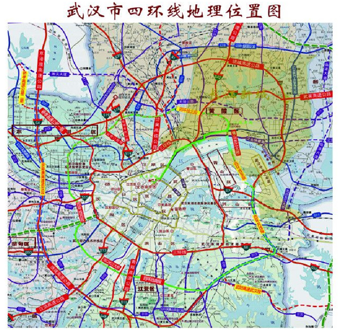 四環(huán)線位于武漢市三環(huán)線和繞城高速公路之間,線路全長(zhǎng)148公里,采用雙向八車道高速公路標(biāo)準(zhǔn)建設(shè),設(shè)計(jì)時(shí)速100公里,是以貨運(yùn)為主,客運(yùn)為輔,連接武漢市六大新城組群的快速通道,是武漢市“環(huán)形+放射”的道路骨架網(wǎng)絡(luò)的有機(jī)組成部分。