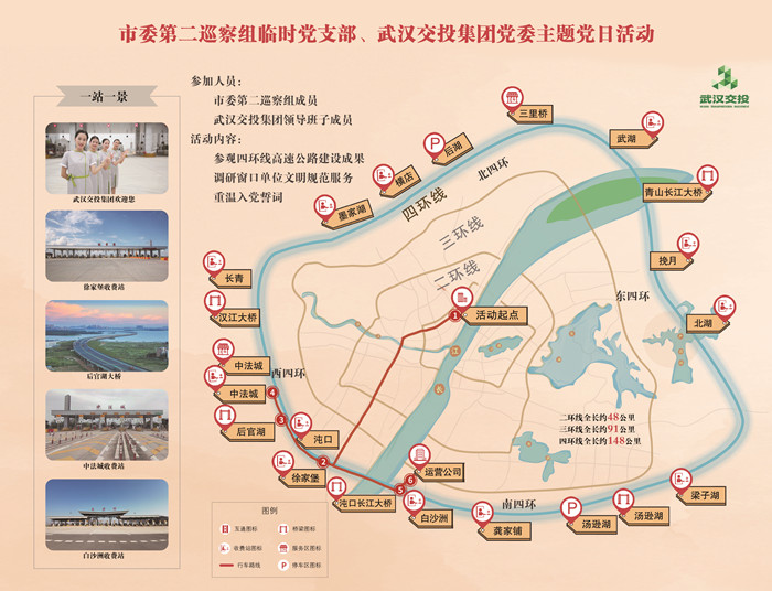 在湖北省首條雙向八車(chē)道高速公路四環(huán)線高速公路上,巡察組全體成員詳細(xì)了解四環(huán)線建設(shè)、運(yùn)營(yíng)的基本情況。途徑四環(huán)線最長(zhǎng)的水上高架橋后官湖大橋時(shí),大家對(duì)武漢交投集團(tuán)“既要金山銀山,也要綠水青山”的綠色施工理念給予充分肯定,對(duì)武漢交投集團(tuán)貫徹新發(fā)展理念,著力構(gòu)建現(xiàn)代化高質(zhì)量綜合立體交通網(wǎng)絡(luò)所付出的努力表示贊賞。四環(huán)線高速公路全長(zhǎng)148公里,位于武漢繞城高速公路與三環(huán)線之間,分為東、西、南、北四段以及青山長(zhǎng)江大橋和沌口長(zhǎng)江大橋,是武漢市“環(huán)形+放射線”道路骨架網(wǎng)的有機(jī)組成部分,是聯(lián)通武漢市六大新城組群、水港、空港、保稅港、物流園區(qū)、產(chǎn)業(yè)園區(qū)之間的快速通道,對(duì)于增強(qiáng)武漢三鎮(zhèn)過(guò)江交通能力,緩解三環(huán)線和京港澳高速公路的交通壓力具有十分重要的意義。